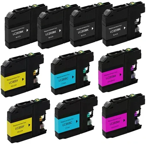 Get exceptional print quality and value with our Brother LC203 high-yield ink cartridge 10-pack from BatteriesandInk.com. This comprehensive bundle includes 4 black, 2 cyan, 2 magenta, and 2 yellow cartridges, each with a 550-page rated yield to keep your Brother printer running smoothly. Compatible with popular models like the MFC-J4320DW, MFC-J4620DW, and MFC-J5520DW, these cartridges deliver the same sharp text and vibrant colors as OEM products while saving you significantly on printing costs. Every purchase is backed by our satisfaction guarantee, ensuring you receive reliable performance with each print job.