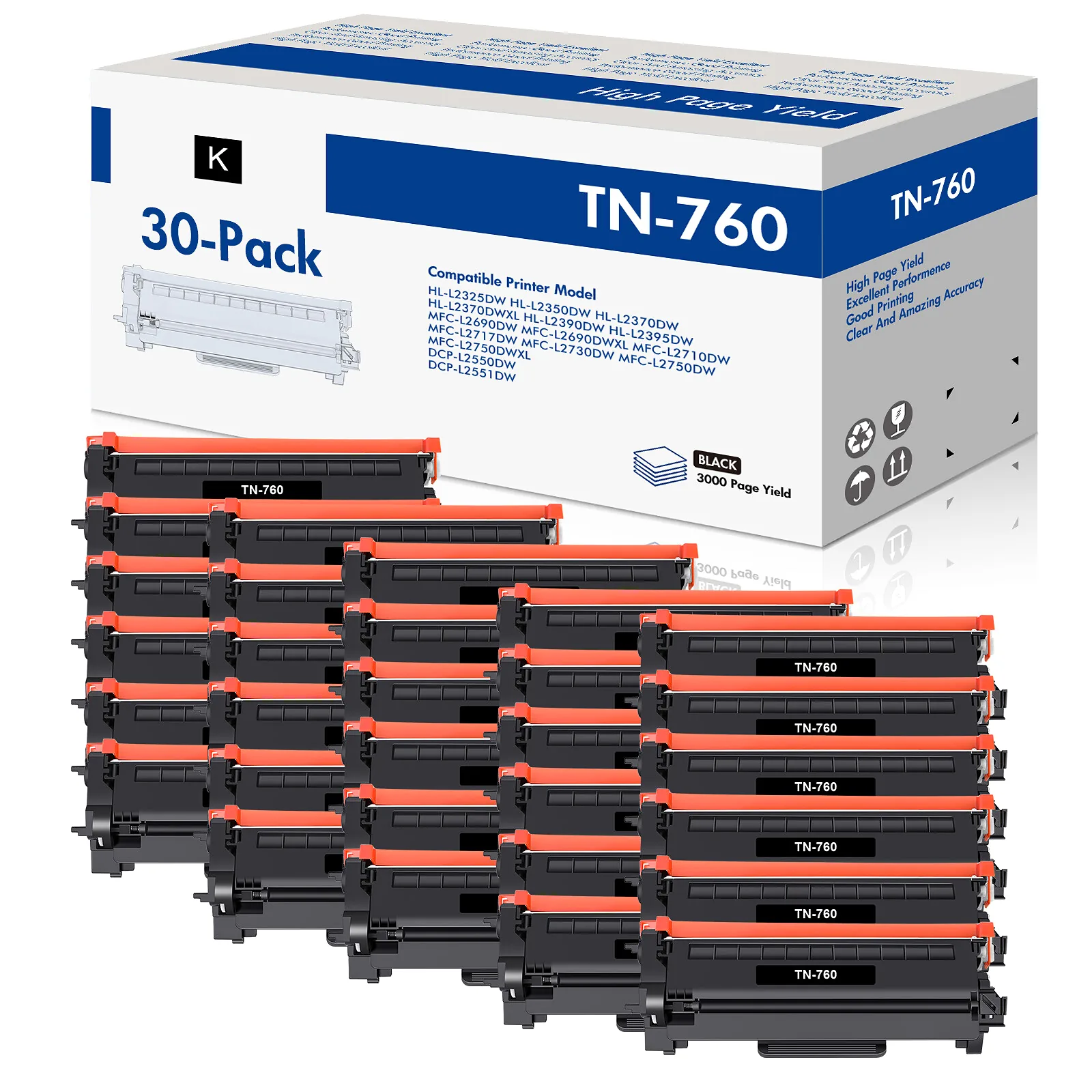 Designed for high-volume black-and-white printing, this Brother TN760 / TN730 toner cartridge delivers a rated yield of up to 3,000 pages per cartridge — making it a practical choice for busy home offices and small workgroups. It fits a wide range of Brother laser printers, including the MFC-L2750DW, MFC-L2710DW, and DCP-L2550DW, and installs without any manual configuration. Each cartridge ships with the IC chip already installed, so your printer automatically recognizes it and tracks ink levels without requiring a manual reset. Available in single and multi-pack options to match your print volume, this cartridge lets you keep your Brother printer running without the high cost of retail-priced supplies. Backed by a 1-year satisfaction guarantee.