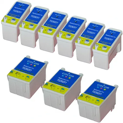 Get exceptional value with this 9-pack bundle of remanufactured Epson T028201 black and T029201 color ink cartridges from batteriesandink.com. This comprehensive set includes 5 black cartridges and 4 color cartridges, providing extended printing capacity for your Epson Stylus C50, C60, or C61 printer. Each cartridge delivers print quality that matches original Epson specifications while saving you significant money compared to OEM prices. Our rigorous quality control ensures reliable performance, and every purchase is backed by our satisfaction guarantee for worry-free printing.