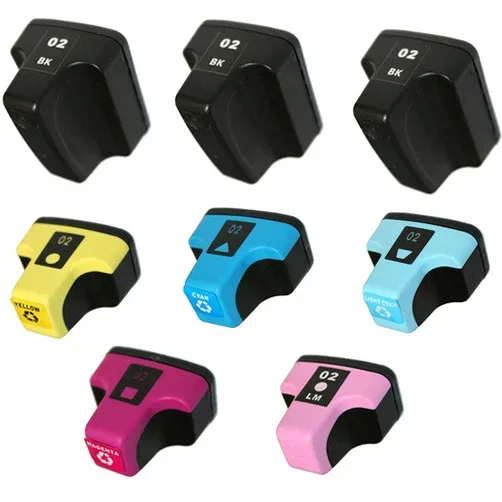 Save big on your HP PhotoSmart printing needs with this comprehensive 8-pack of HP 02 ink cartridges from BatteriesAndInk.com. This complete set includes 3 black cartridges and 5 color cartridges (cyan, magenta, yellow, light cyan, and light magenta) to handle all your printing projects. Each black cartridge delivers up to 660 pages while color cartridges offer 370-page rated yields. Perfect for PhotoSmart 3210, PhotoSmart 3310, and PhotoSmart 8200 series printers, these remanufactured cartridges match OEM quality while saving you significant money. Backed by our satisfaction guarantee for worry-free printing.